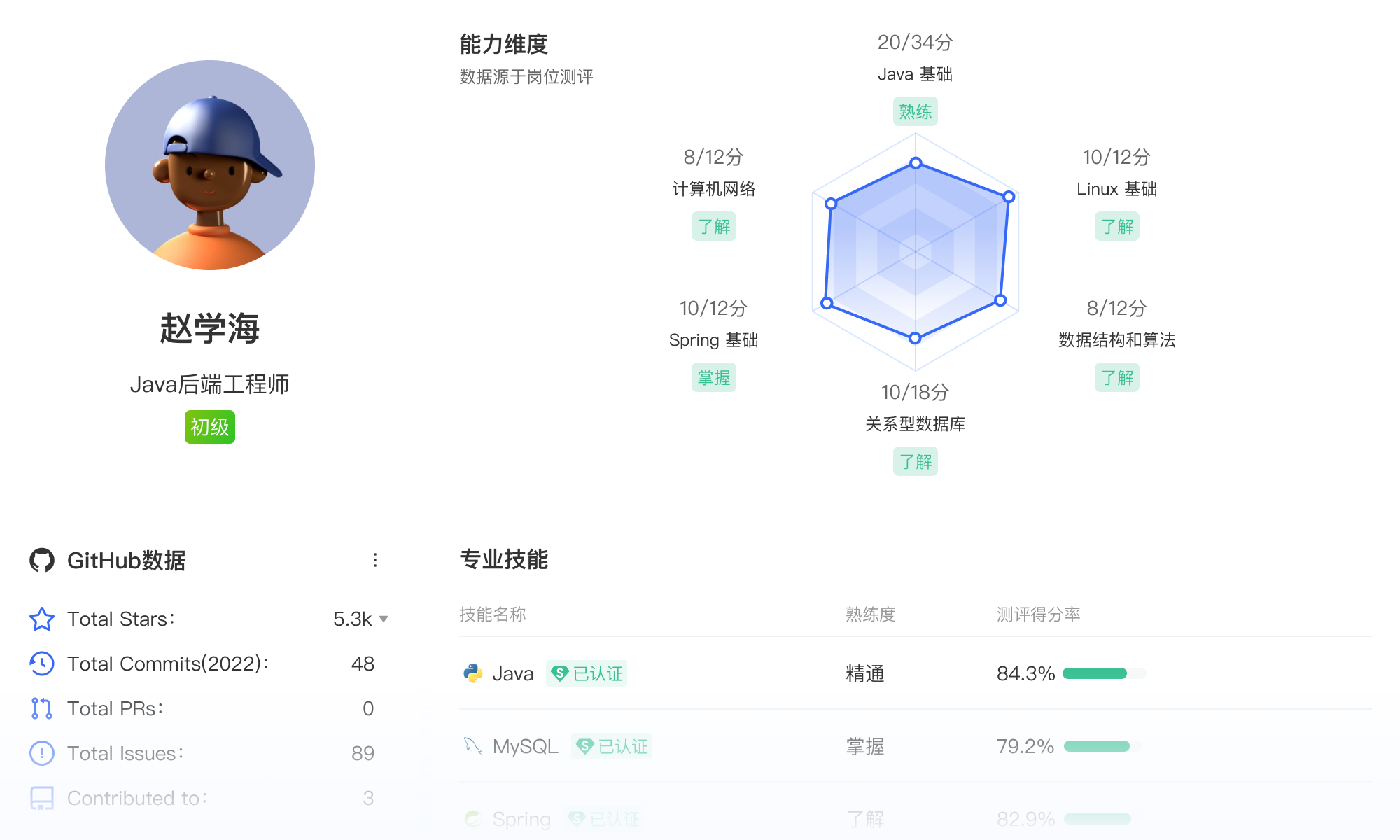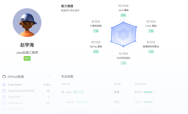 开发者个人能力评估、岗位测评、技能点测评